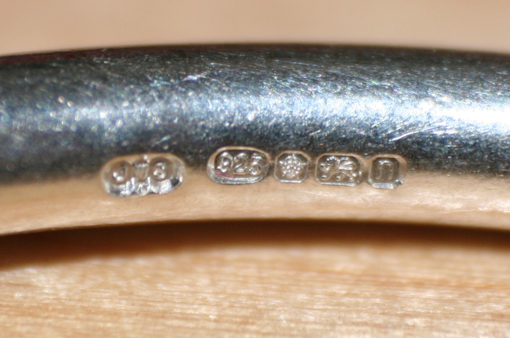 Hallmarking is split into several different marks. There are marks that indicate the maker, the assay office that carried out the testing, purity marks of the metal being tested and others specific to regions and countries. A quick breakdown of the hallmark in this picture shows the makers mark (which is actually my mark), 925 indicates the article is sterling silver, next is the Sheffield Rose which is the mark for the Sheffield Assay Office. Next is the lion which is another mark which shows the article is sterling silver and finally we have a date letter stamp for the year 2012.