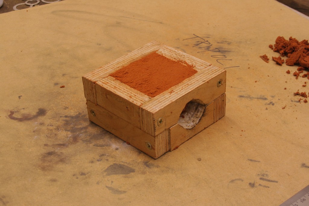 Sprinkle more talcum powder on top of the carved object and rub in. Then place the second casting ring on top making sure the alignment marks are in the right place. All casting rings have a method to make sure you can place the rings together the same way every single time. For my casting set I have 2 pins pushed into the wood but sticking out. They go into holes in my second half. They always join in the same way and very accurately.