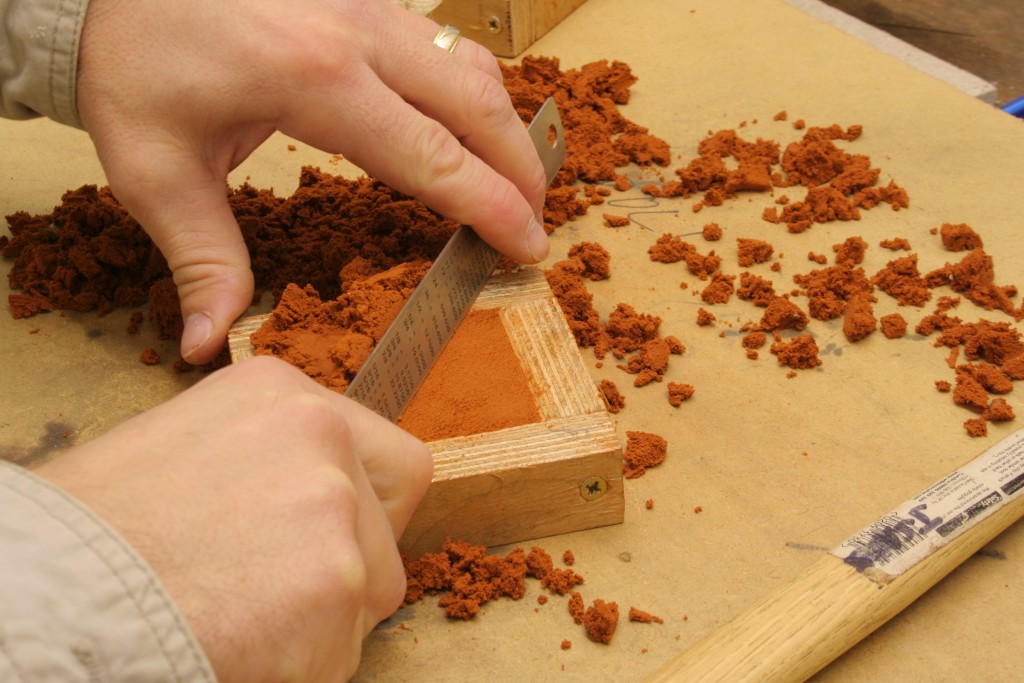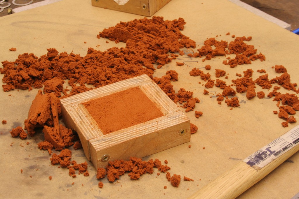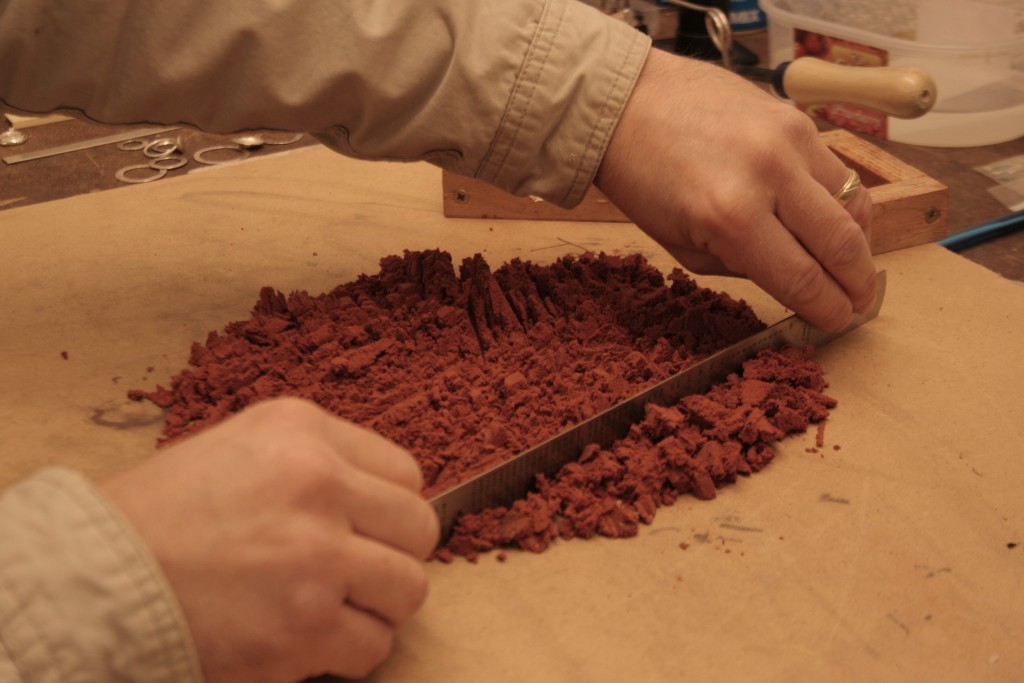 Now we put more delft clay on top and pack as before for the bottom half of the set. Hammer it to get a good packed mold. The tighter the packing the more accurate the imprint we make.