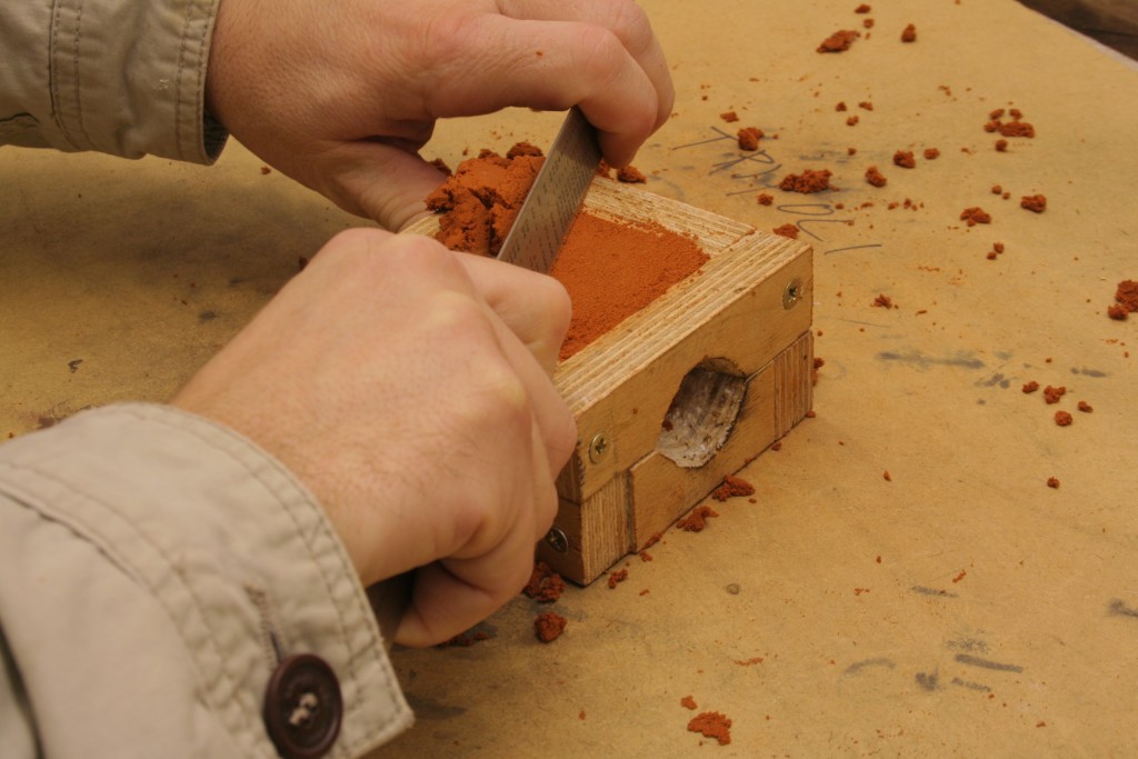 It is very important that the delft clay is flat at this stage. If there are bumps then scrap until flat. If there are depressions then go back one step and packed more delft clay in. Making a good cast requires that this part of the casting set is as filled as possible.