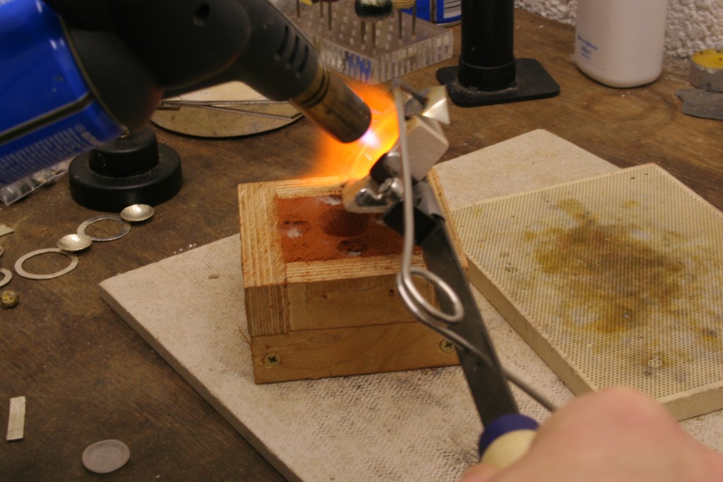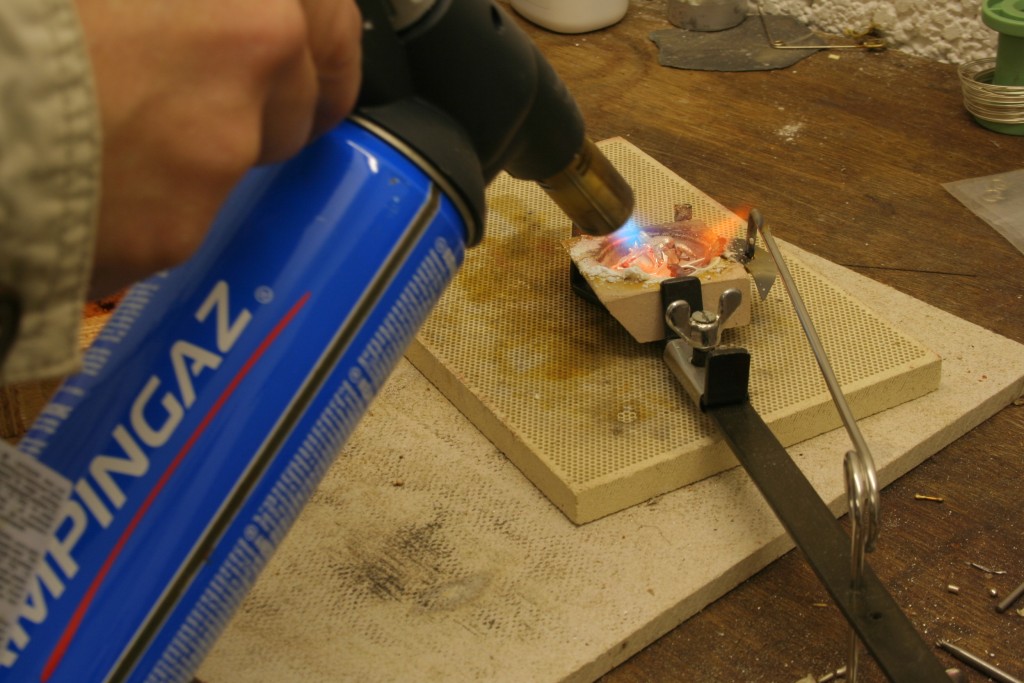 I have positioned my casting set ready for pouring. My scrap silver is in the crucible being heated. The sterling silver is molten at around 900 degrees centigrade so I am using a gas torch that has a big flame around 1300 degrees. Just direct the flame onto the silver moving it around slowly