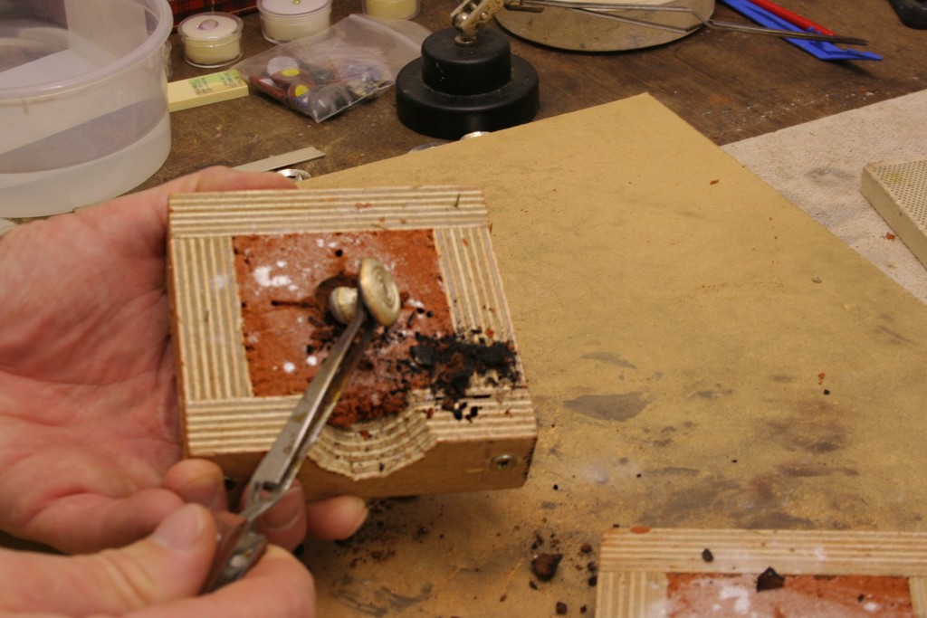 I get my reverse tweezers to delve into the clay behind my cast silver where the sprue is and pull